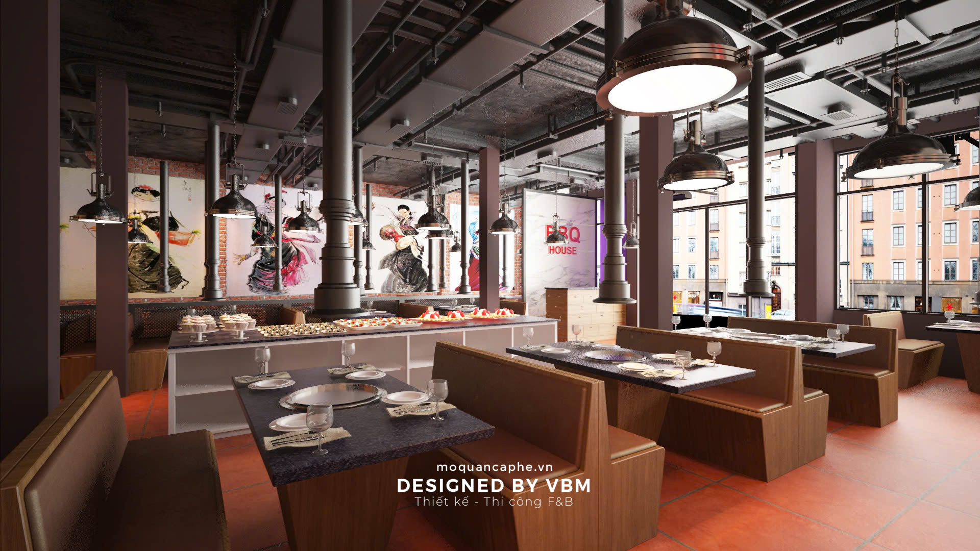 BBQ House được thiết kế theo phong cách công nghiệp hiện đại, kết hợp hoàn hảo giữa các vật liệu như gạch thô, gỗ và kim loại. Tông màu chủ đạo là đỏ, nâu và xám, tạo nên không gian vừa mạnh mẽ vừa ấm áp, thích hợp cho các buổi tiệc nướng cùng gia đình và bạn bè. Thiết kế không gian mở giúp khách hàng có thể tận hưởng trọn vẹn không gian và bầu không khí thoải mái.
