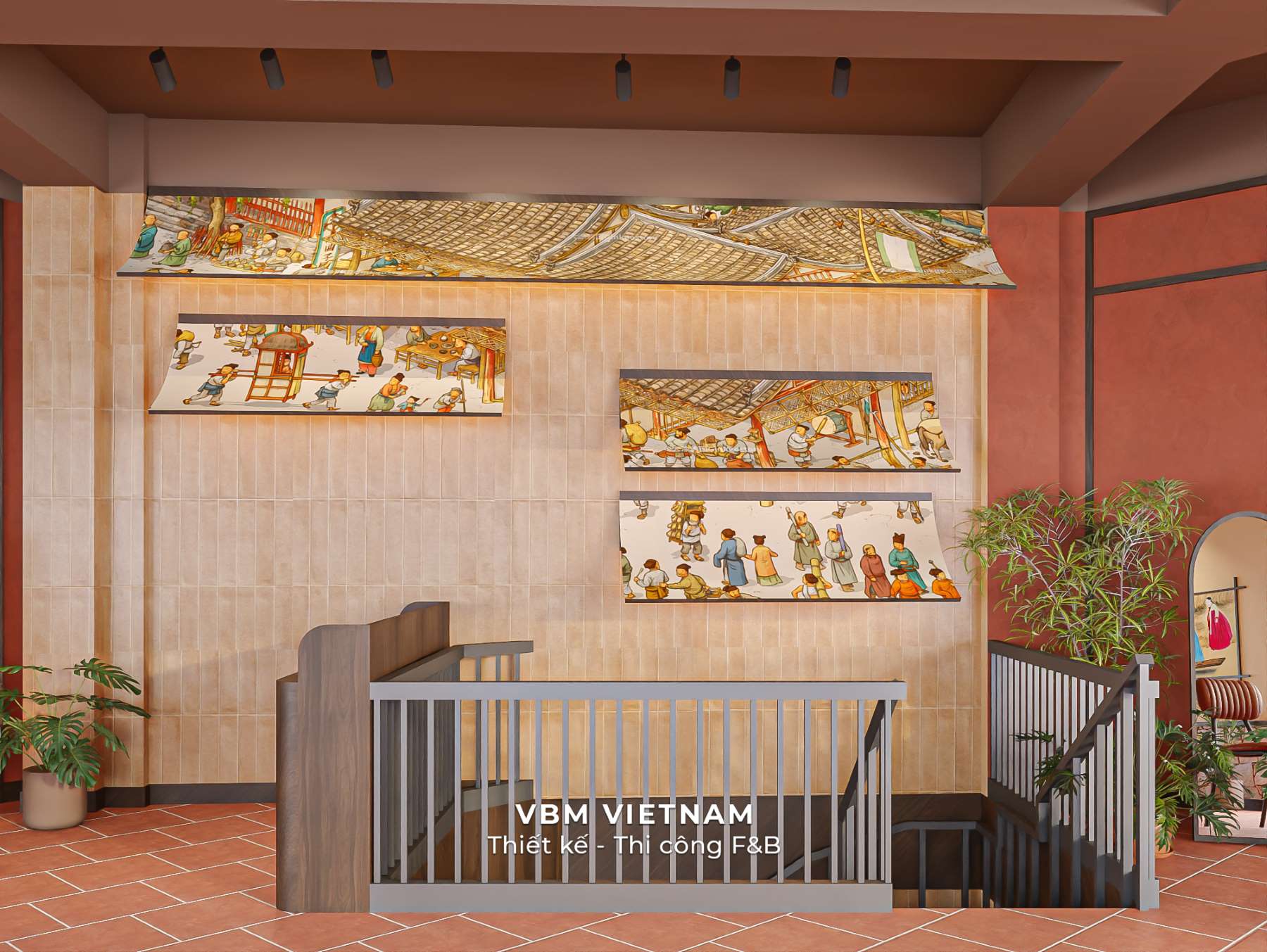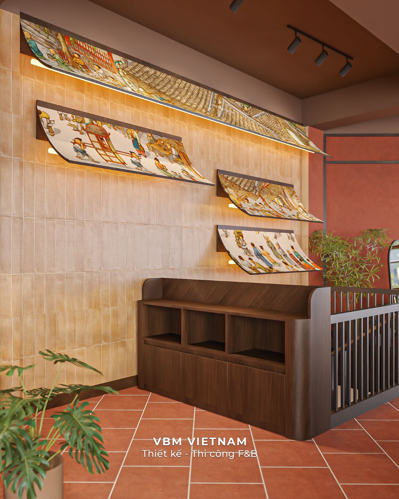Điểm nhấn trang trí: Tranh tường kể lại những câu chuyện văn hóa Hàn, kết hợp ánh sáng dịu nhẹ từ đèn lồng, tạo nên không gian thư thái và đậm bản sắc.