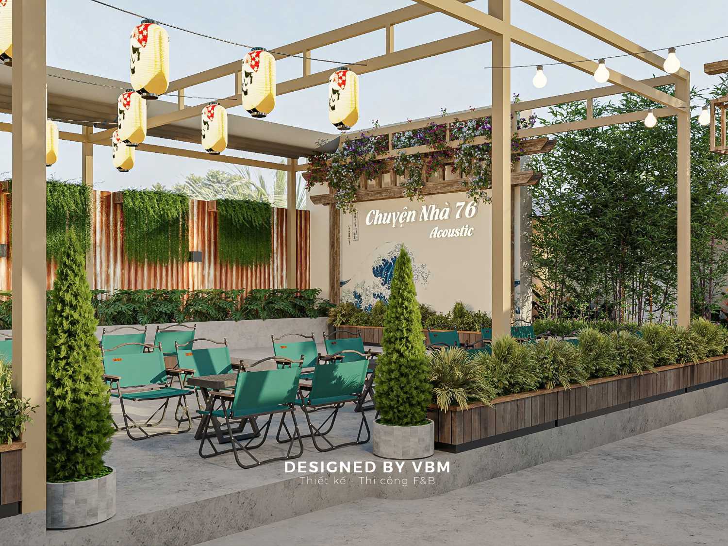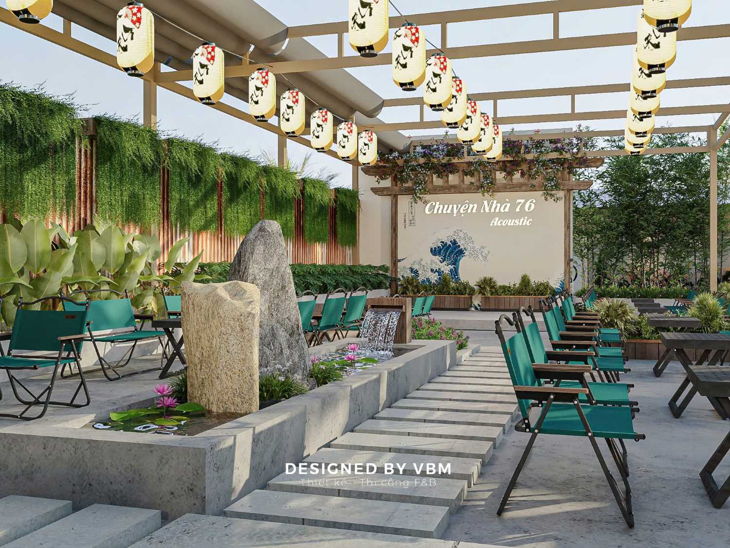 Hơn nữa, sân khấu acoustic ngoài trời tại “Chuyện Nhà 76” là một điểm nhấn không thể bỏ qua. Với hệ thống đèn lồng trang trí theo phong cách Nhật Bản, kết hợp tiểu cảnh đá – nước – cây xanh, khu vực này không chỉ phù hợp cho các buổi biểu diễn âm nhạc mà còn là nơi lý tưởng để thư giãn sau một ngày dài.