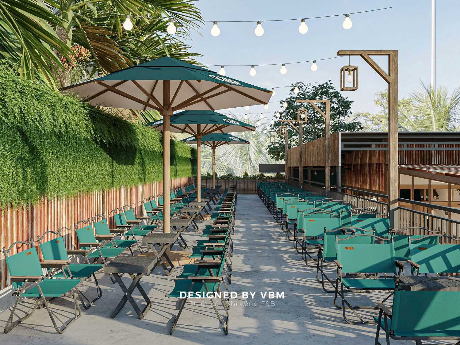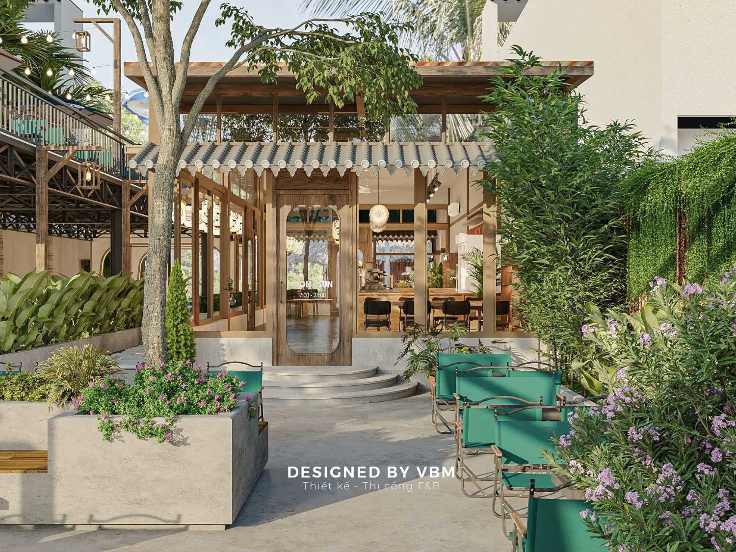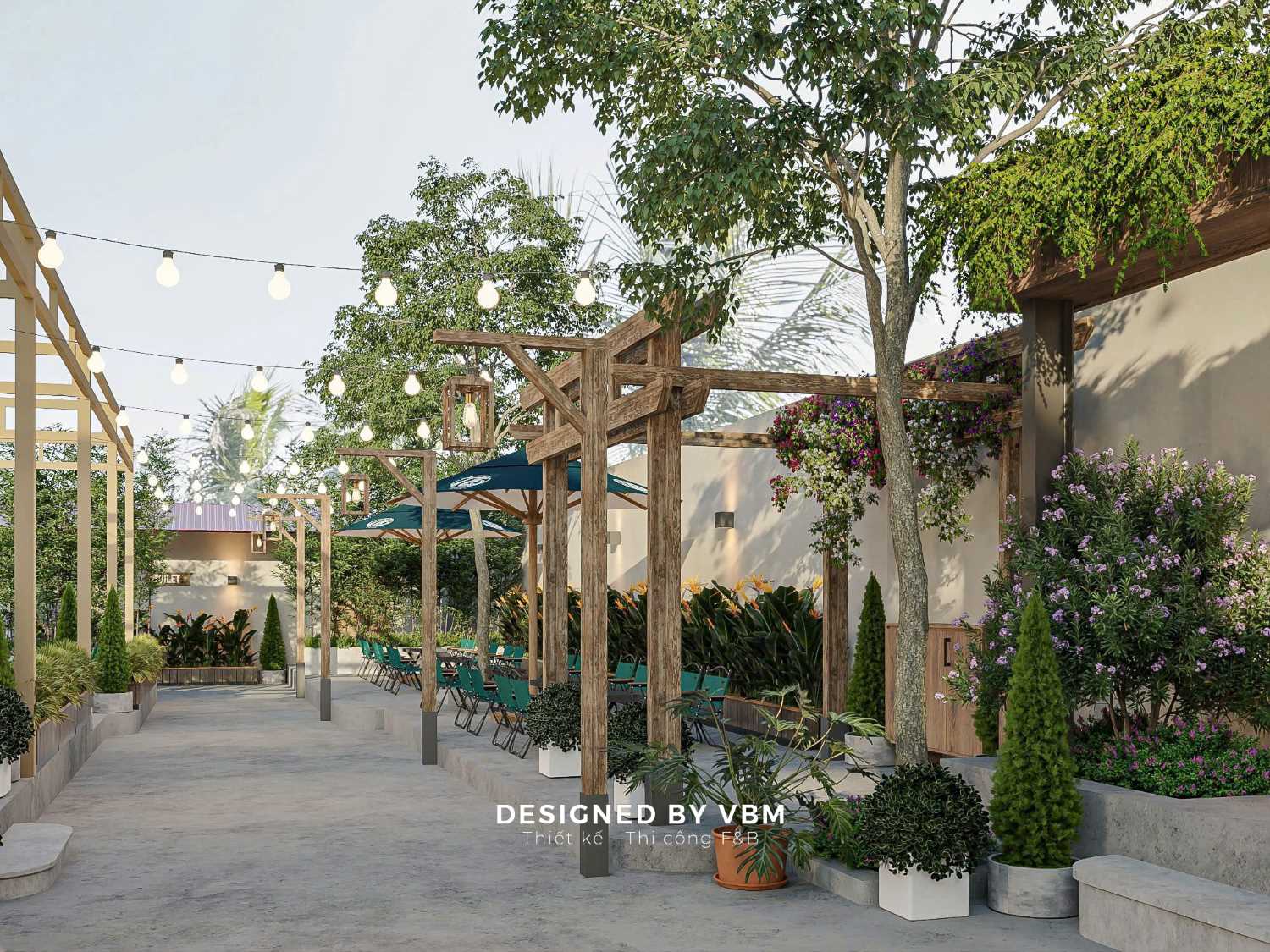 Trước tiên, khu vực mặt tiền được thiết kế mở, kết hợp mảng xanh rủ tự nhiên và bảng hiệu gỗ tạo cảm giác thân thiện, gần gũi. Tiếp theo, khi bước vào bên trong, khách hàng sẽ cảm nhận được sự rộng rãi và thoáng đãng với lối đi chính kéo dài xuyên suốt không gian, dẫn lối vào các khu vực cà phê, nước ép, và sân khấu acoustic.