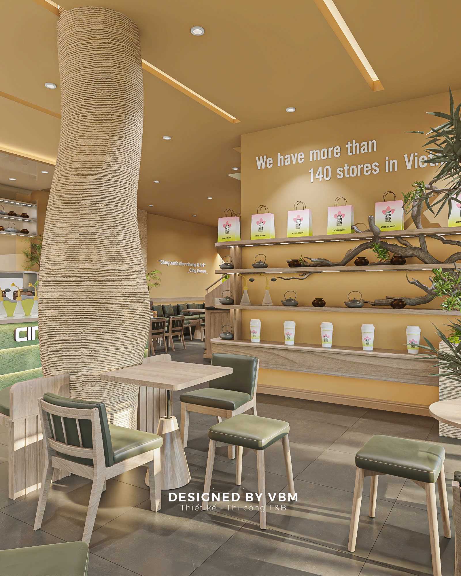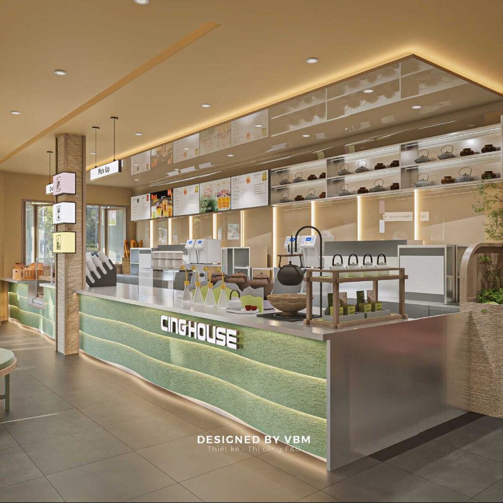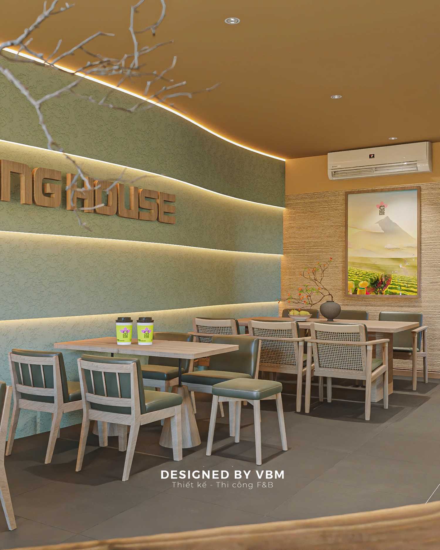 Không gian bên trong được bố trí khoa học, giúp tối ưu công năng phục vụ, đồng thời tạo điểm nhấn với quầy trà hiện đại và khu vực seating thoải mái, giúp khách hàng tận hưởng trọn vẹn hương vị trà Ô Long trong không gian thư thái nhất.