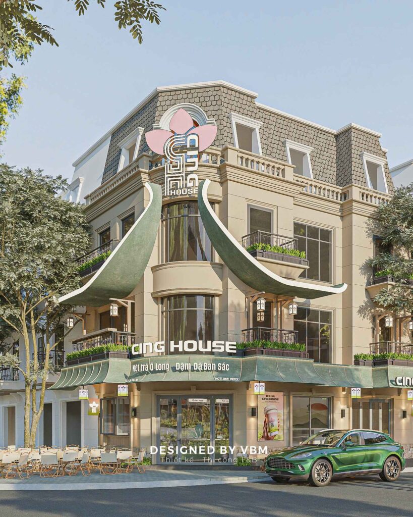 Ngay từ mặt tiền, Cing House thu hút ánh nhìn với thiết kế mái cong cùng tông màu nhẹ nhàng và logo hoa sen cách điệu – biểu tượng cho sự thanh lọc và tinh tế. Hơn nữa, việc bố trí mặt bằng theo khối nhà ba tầng giúp tối ưu hóa công năng sử dụng, đồng thời mở rộng không gian phục vụ cả trong nhà lẫn ngoài trời.