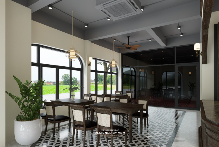 - Không gian mở: Cửa kính lớn tận dụng ánh sáng tự nhiên, mang lại cảm giác thoáng đãng và gần gũi với thiên nhiên.