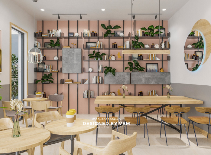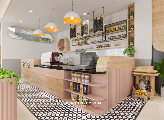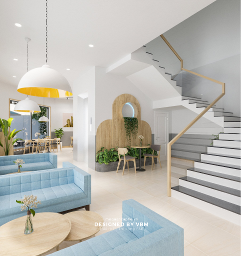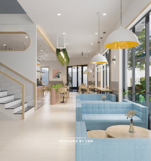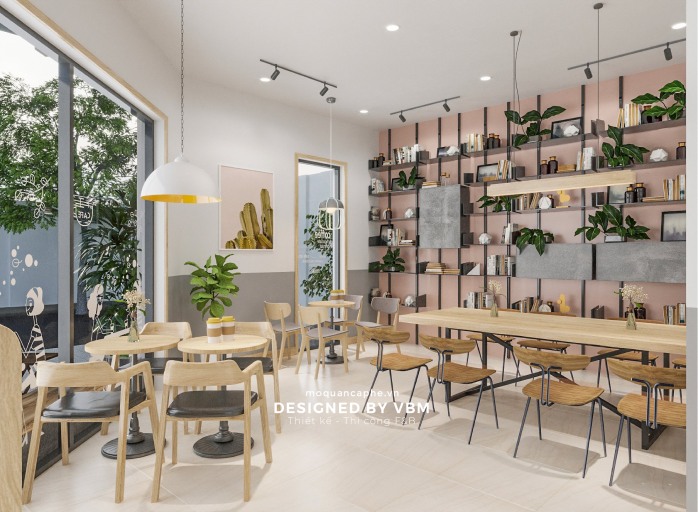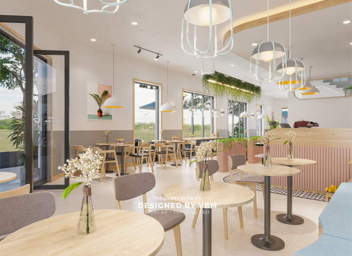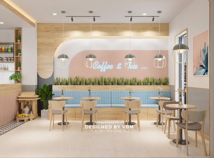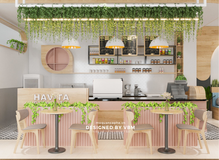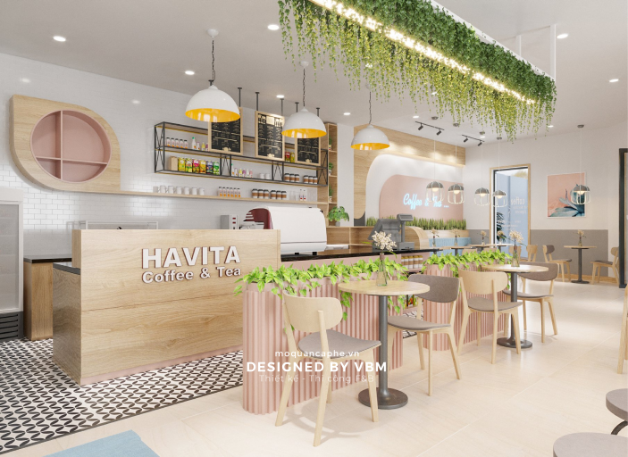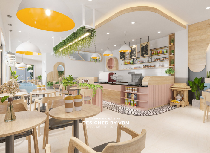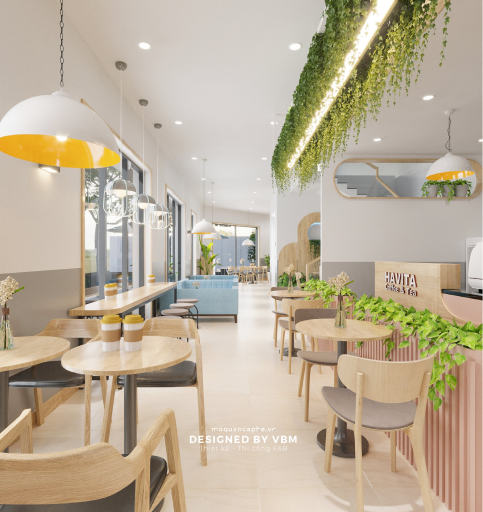 Quán sử dụng tông màu pastel dịu nhẹ, kết hợp với các yếu tố nội thất từ gỗ tự nhiên và cây xanh, tạo nên sự cân bằng hoàn hảo giữa hiện đại và thiên nhiên. Thiết kế nhấn mạnh vào sự tối giản nhưng vẫn tinh tế, với điểm nhấn là khu vực quầy bar được trang trí bằng cây leo xanh mướt, mang đến cảm giác thư giãn và gần gũi.