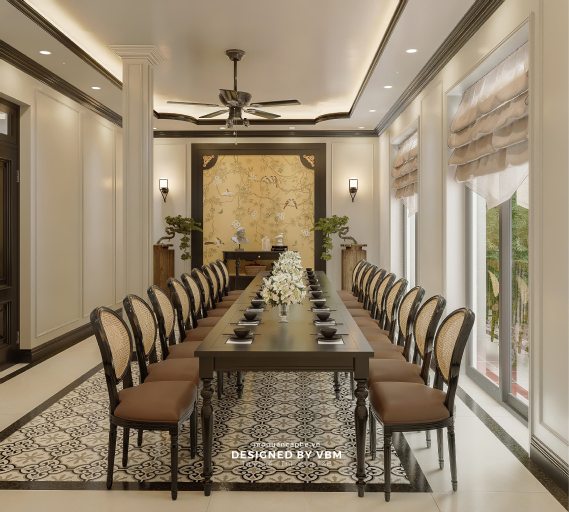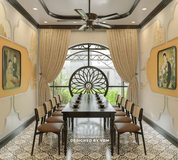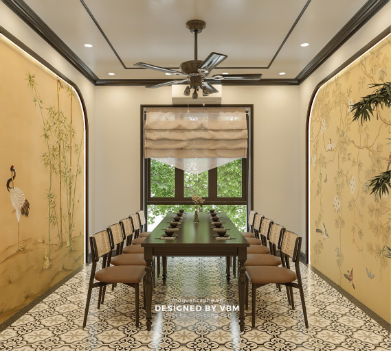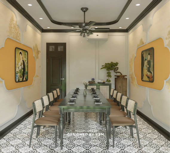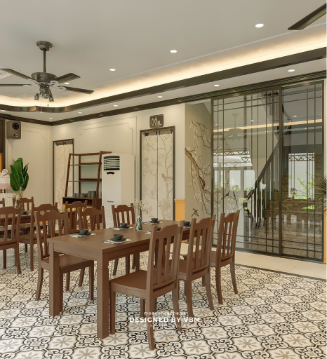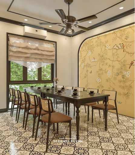 Gam màu vàng, nâu và trắng tạo nên không gian ấm cúng, thanh lịch. Chất liệu gỗ tự nhiên, mây tre đan kết hợp với gạch hoa truyền thống mang đến cảm giác gần gũi và tinh tế.