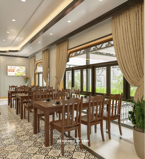 Mặt tiền nhà hàng nổi bật với màu vàng ấm kết hợp các chi tiết hoa văn cổ điển, mang đến vẻ đẹp sang trọng nhưng gần gũi. Hệ thống cửa kính lớn giúp tận dụng ánh sáng tự nhiên và tạo cảm giác thoáng đãng.