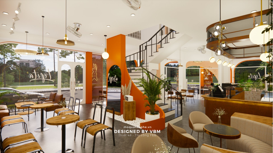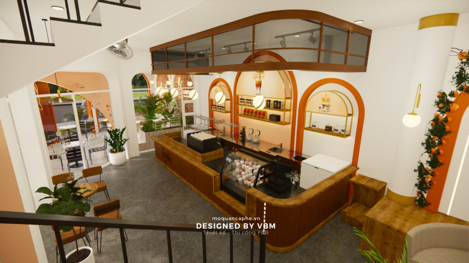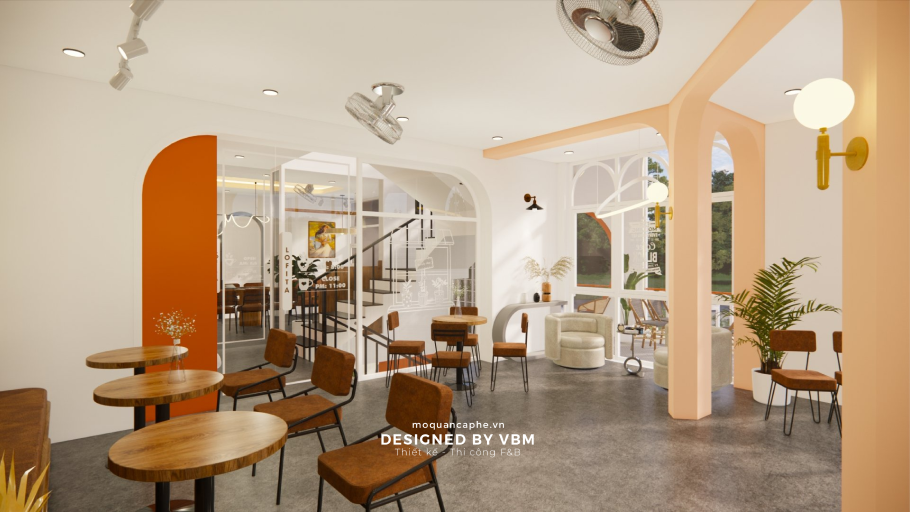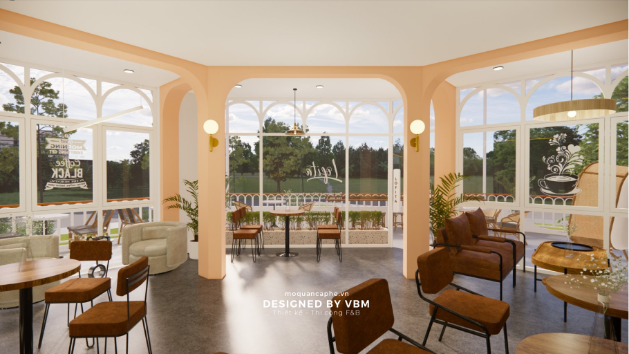 Điểm nhấn đặc biệt của thiết kế là các khung cửa vòm lớn, giúp tối ưu hóa ánh sáng tự nhiên, tạo cảm giác thoáng đãng và thoải mái cho khách hàng. Nội thất được bố trí hài hòa, kết hợp giữa bàn ghế gỗ tự nhiên và những chi tiết trang trí sáng tạo, đem đến một không gian vừa sang trọng, vừa gần gũi.