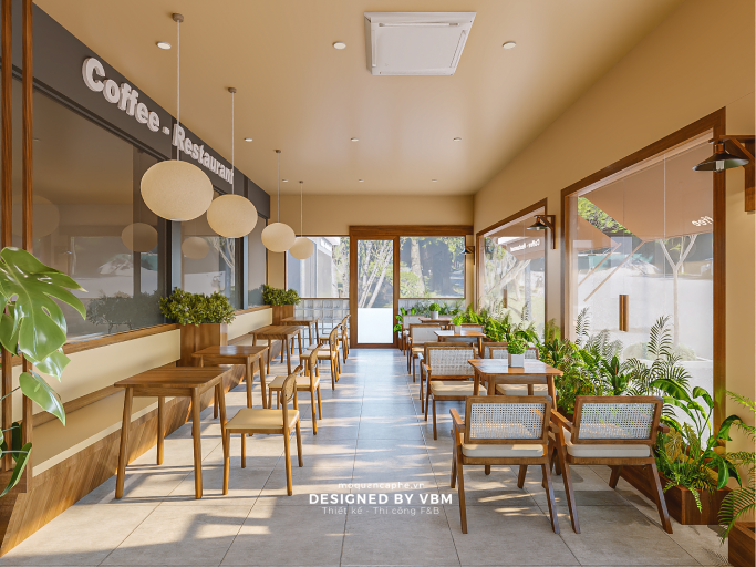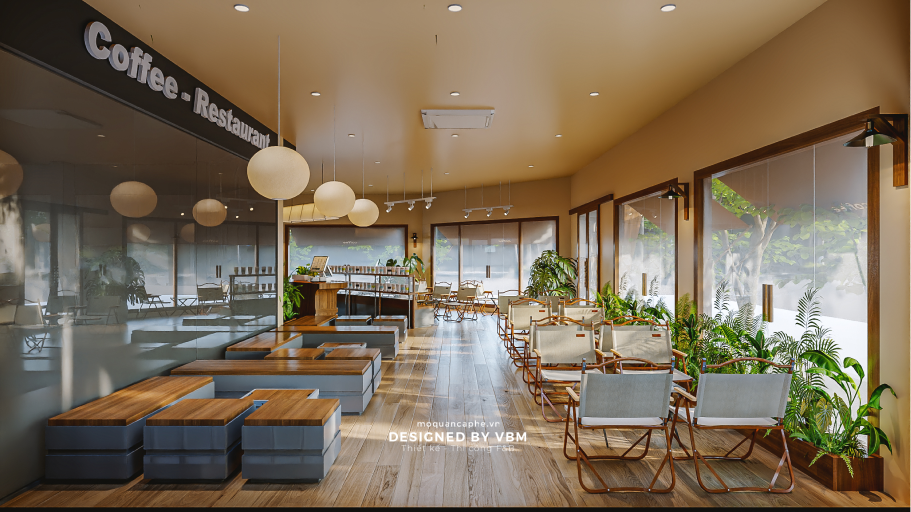 Khu vực bên ngoài được bao phủ bởi sắc xanh từ cây cối và những khoảng sân thoáng đãng, là nơi lý tưởng để khách hàng thưởng thức cà phê dưới ánh nắng nhẹ nhàng. Bên trong, sự kết hợp giữa nội thất gỗ tự nhiên, ánh sáng dịu nhẹ, cùng cách bài trí tinh tế, mang lại cảm giác dễ chịu và thoải mái cho mọi thực khách.