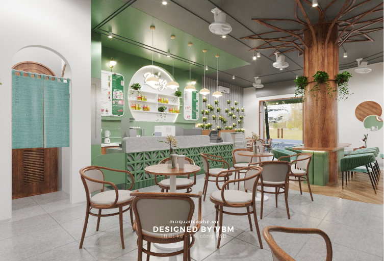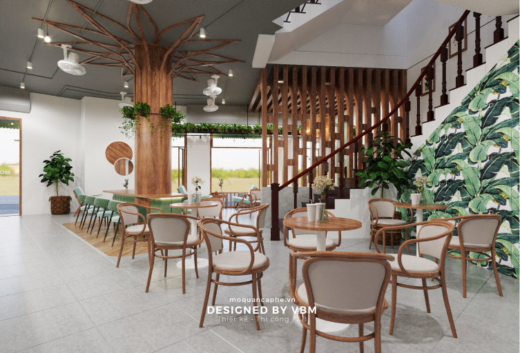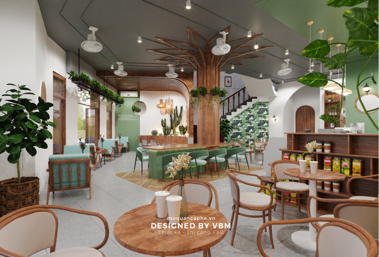 Không gian bên ngoài của quán tạo cảm giác mộc mạc với những ô cửa sổ bo tròn độc đáo và hàng hiên được trang trí bằng cây xanh, tạo điểm nhấn gần gũi và thư giãn cho khách hàng. Nội thất bên trong được bài trí thông minh, tạo nên sự kết nối linh hoạt giữa các khu vực chỗ ngồi. Điểm đặc biệt trong thiết kế là “cây gỗ trung tâm” – vừa là biểu tượng của sự sống, vừa là trung tâm kết nối không gian.