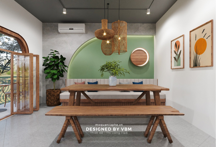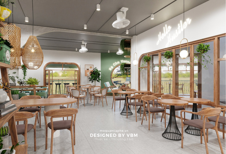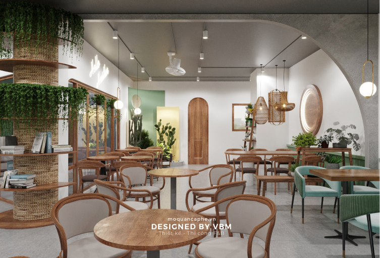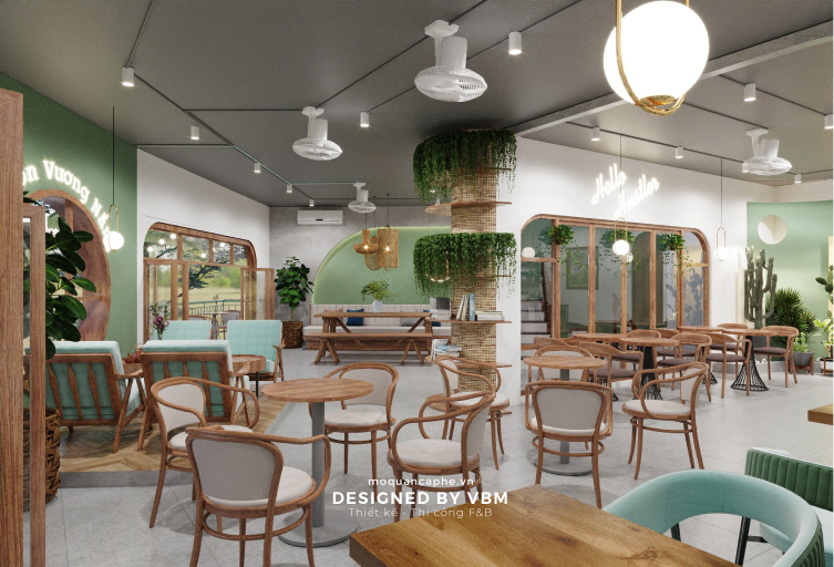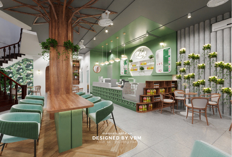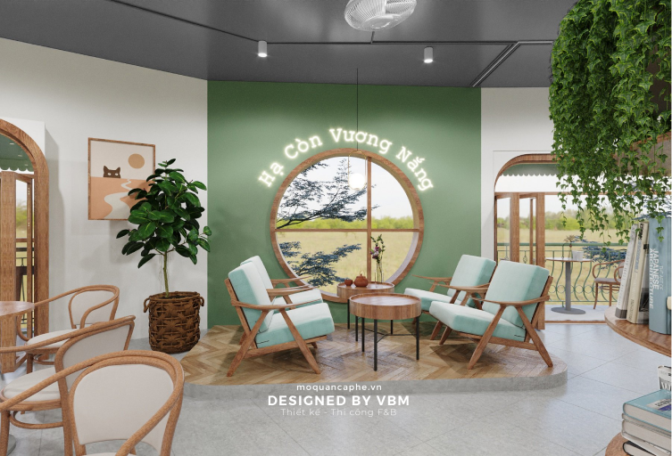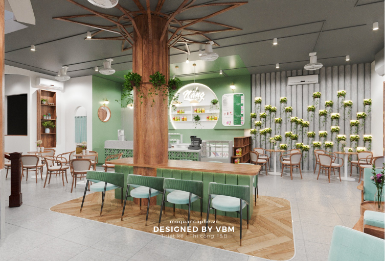 Dự án thiết kế Nắng Cafe là một minh chứng điển hình cho sự kết hợp hài hòa giữa không gian thiên nhiên và phong cách nội thất hiện đại, được thực hiện bởi đội ngũ chuyên gia thiết kế của VBM Việt Nam. Với mục tiêu mang đến trải nghiệm thoải mái và gần gũi, Nắng Cafe được thiết kế với gam màu xanh lá dịu nhẹ làm chủ đạo, kết hợp các yếu tố gỗ tự nhiên và ánh sáng tự nhiên tràn ngập không gian.