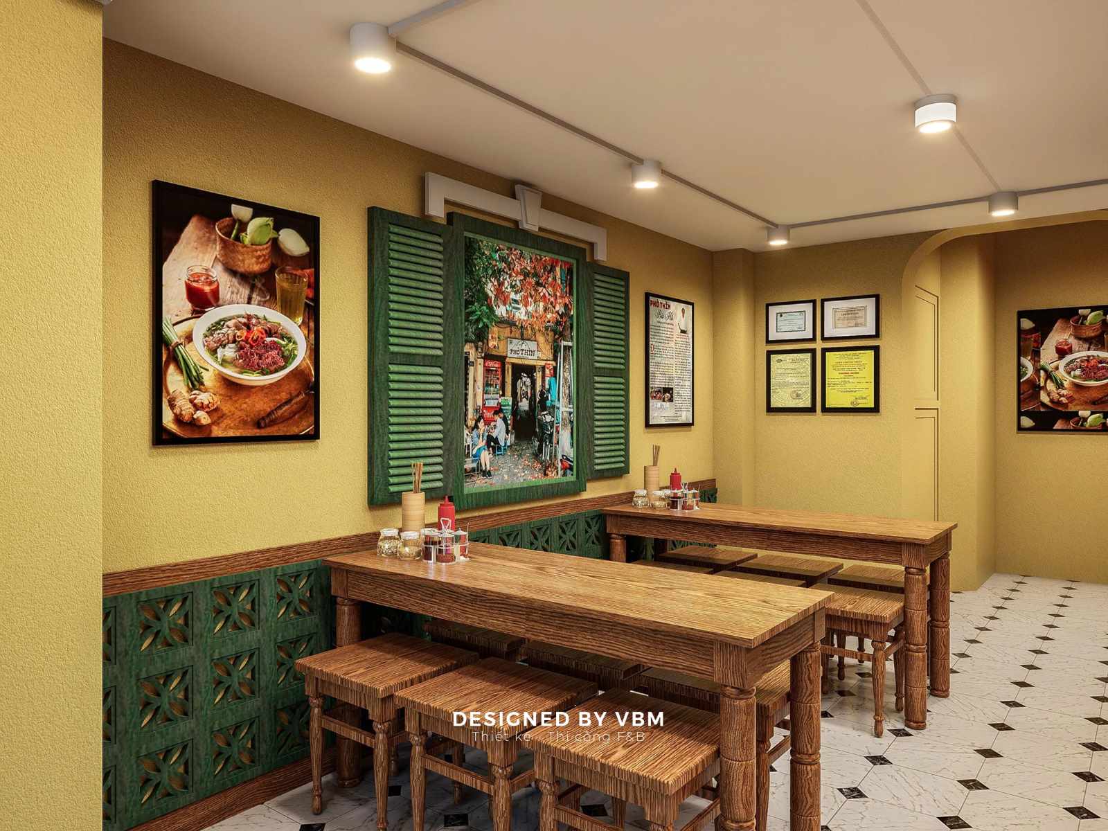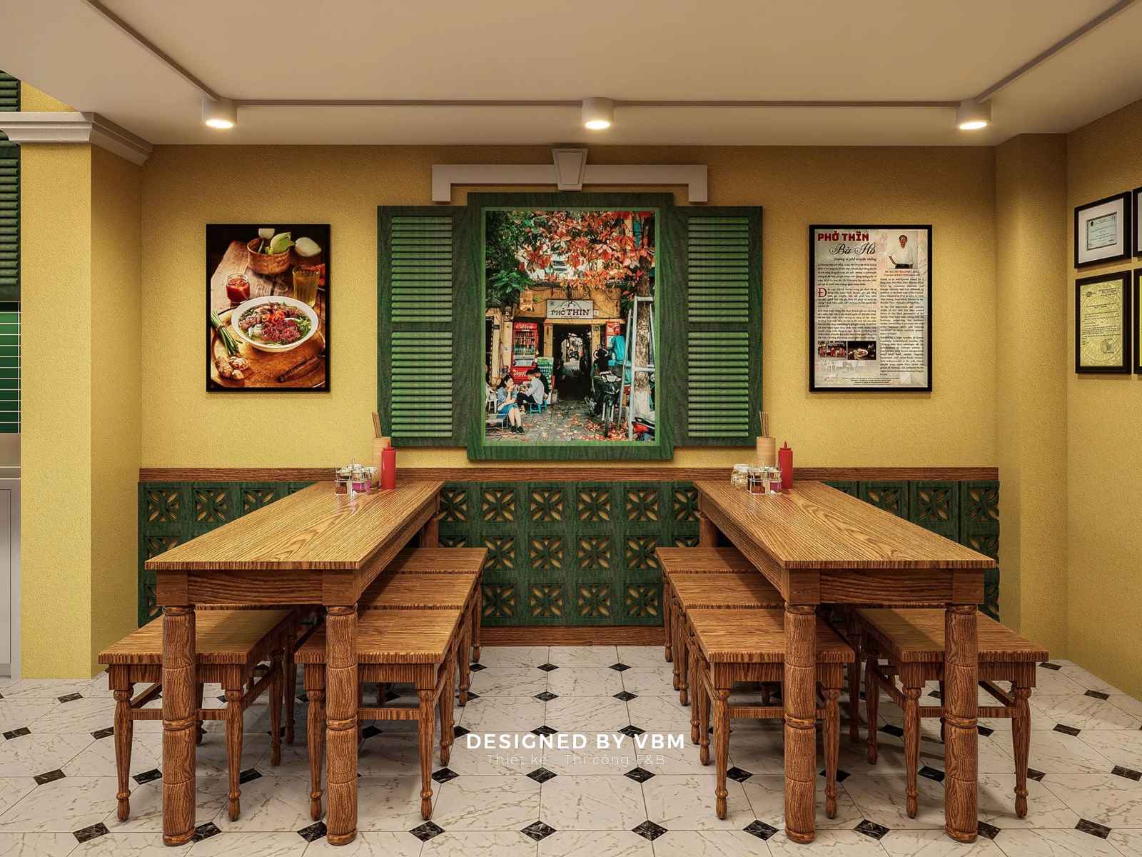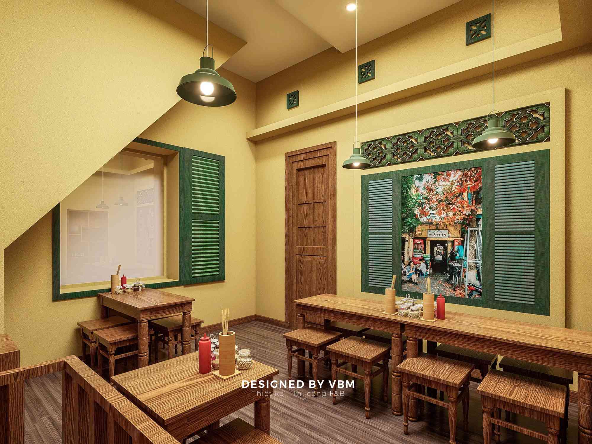- Mỗi góc nhỏ đều được tính toán để tạo cảm giác gần gũi, thân thuộc, gợi lại hình ảnh những quán phở vỉa hè quen thuộc.
