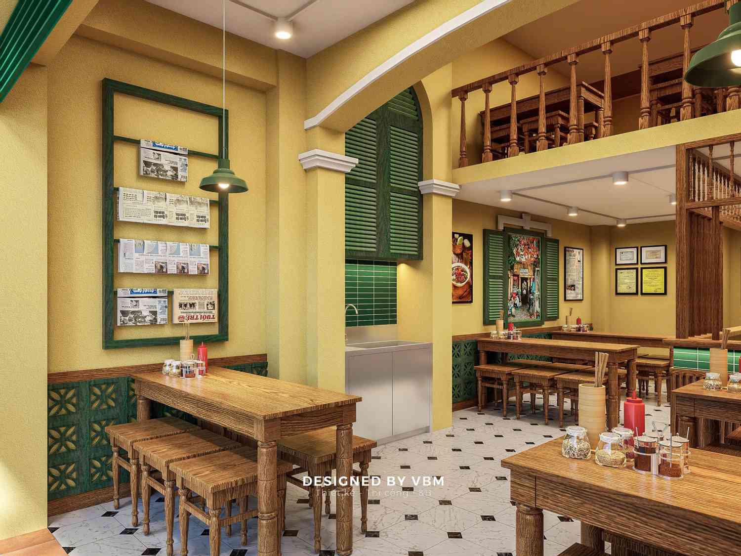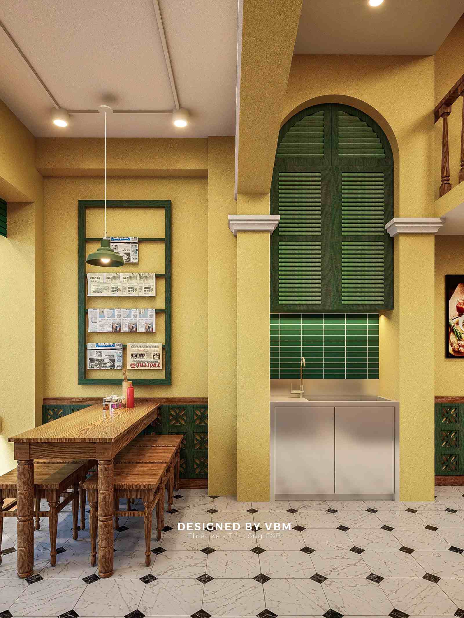 - Lấy cảm hứng từ Hà Nội những thập niên 80 – 90, không gian được phối hợp khéo léo giữa tường vàng, cửa gỗ xanh, gạch bông cổ và nội thất tre mộc mạc.
