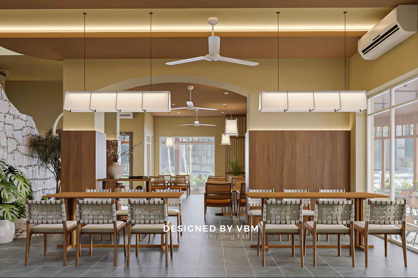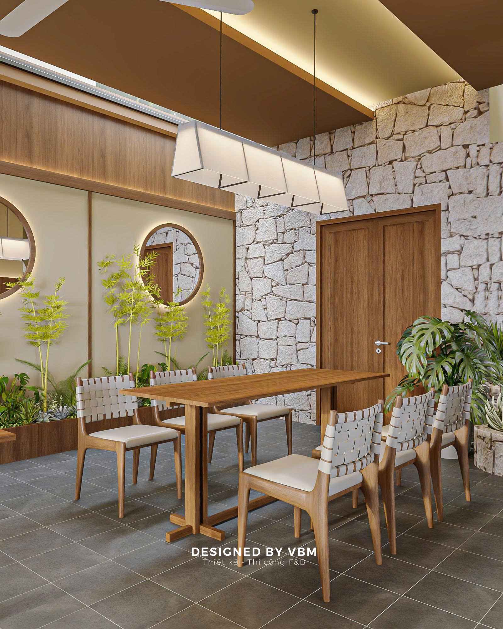 Đá tự nhiên, gỗ mộc, và sắc xanh dịu dàng không chỉ tạo nên không gian thoải mái, thư thái mà còn truyền tải trọn vẹn giá trị mà VBM luôn hướng tới: thiết kế không gian để chạm vào cảm xúc người trải nghiệm.