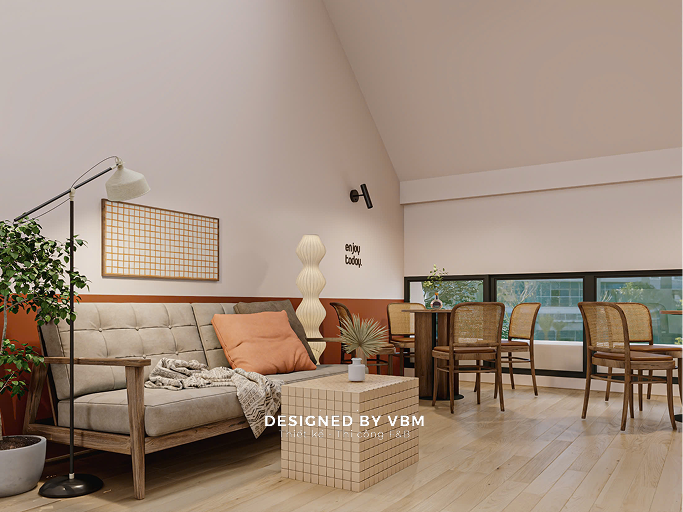 - Cảm hứng nổi bật: Sắc màu cam và nâu đan xen trong từng không gian của quán mang đến sự năng động tươi mới tại cảm giác thư giãn
