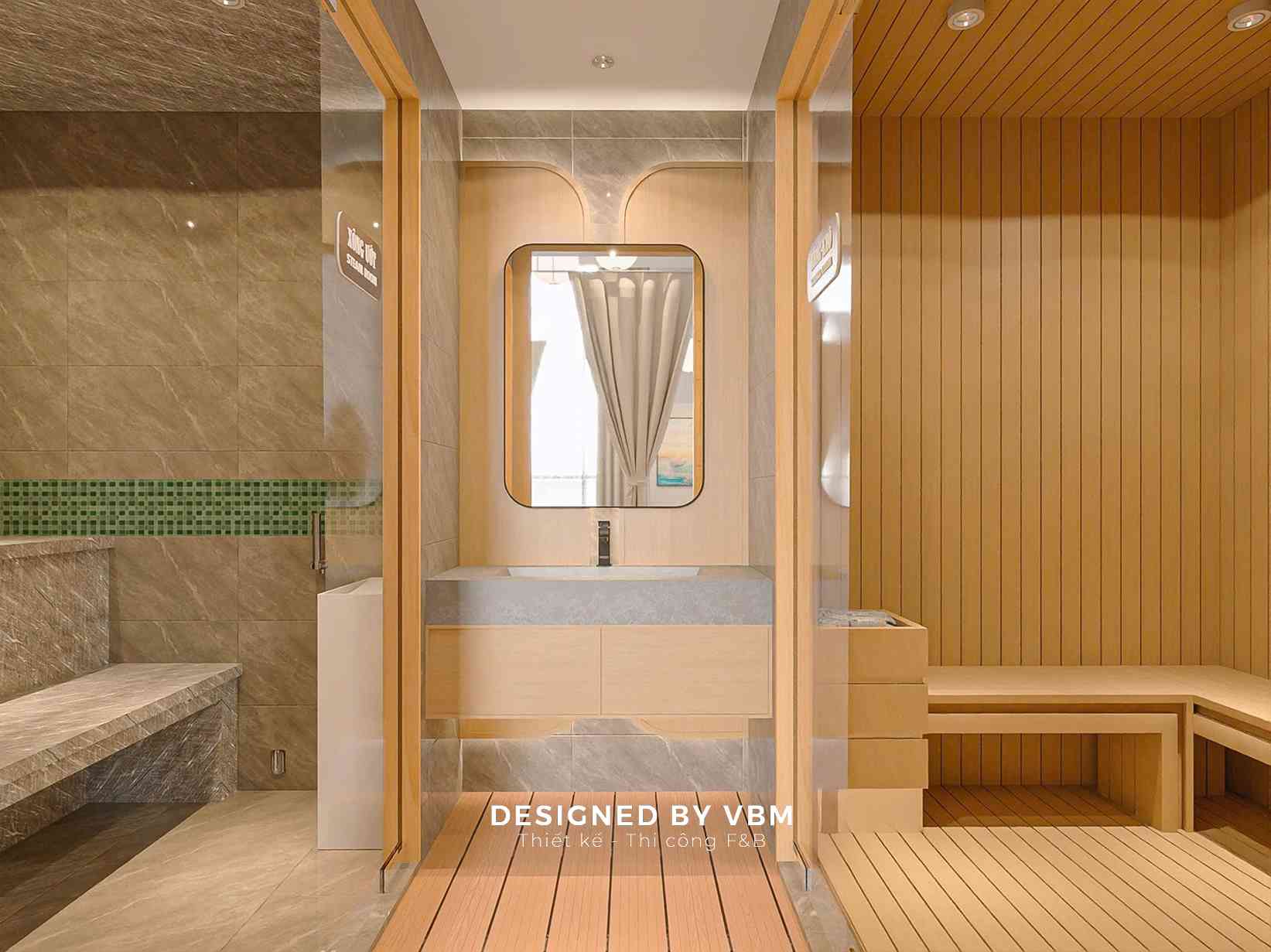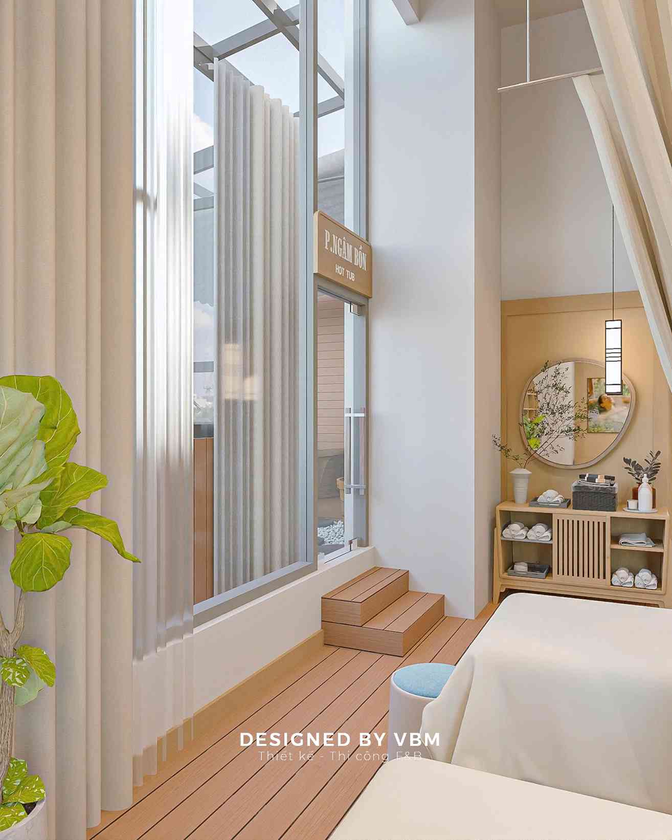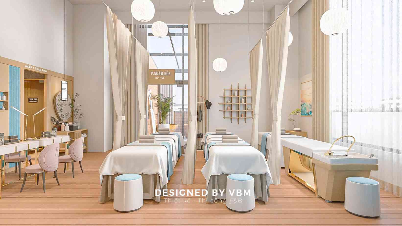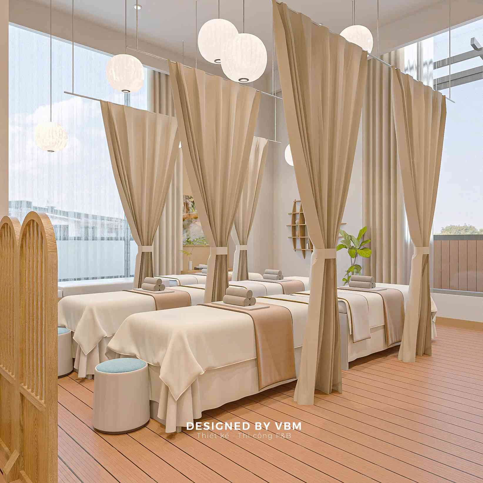 - Không gian chức năng khoa học: Phân chia khu massage, ngâm thảo mộc, và khu nghỉ ngơi rõ ràng nhưng liên kết mềm mại qua rèm và vách ngăn nhẹ.