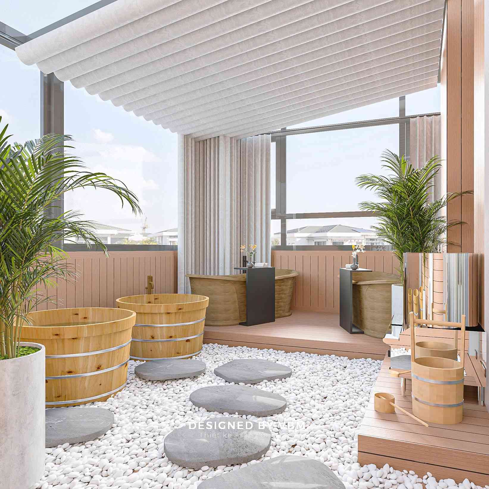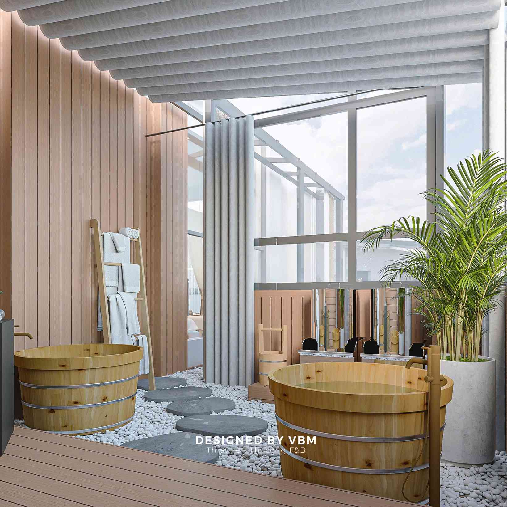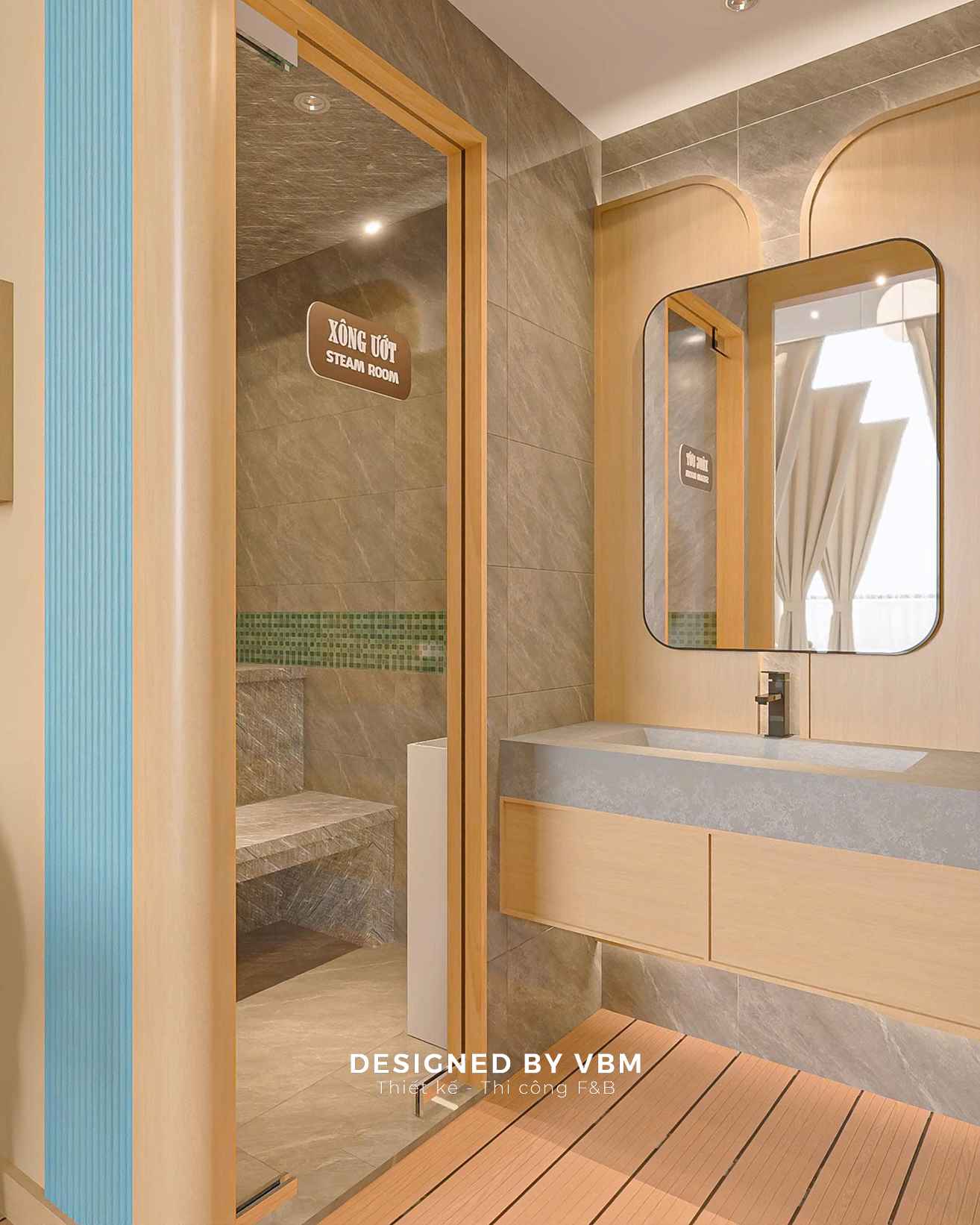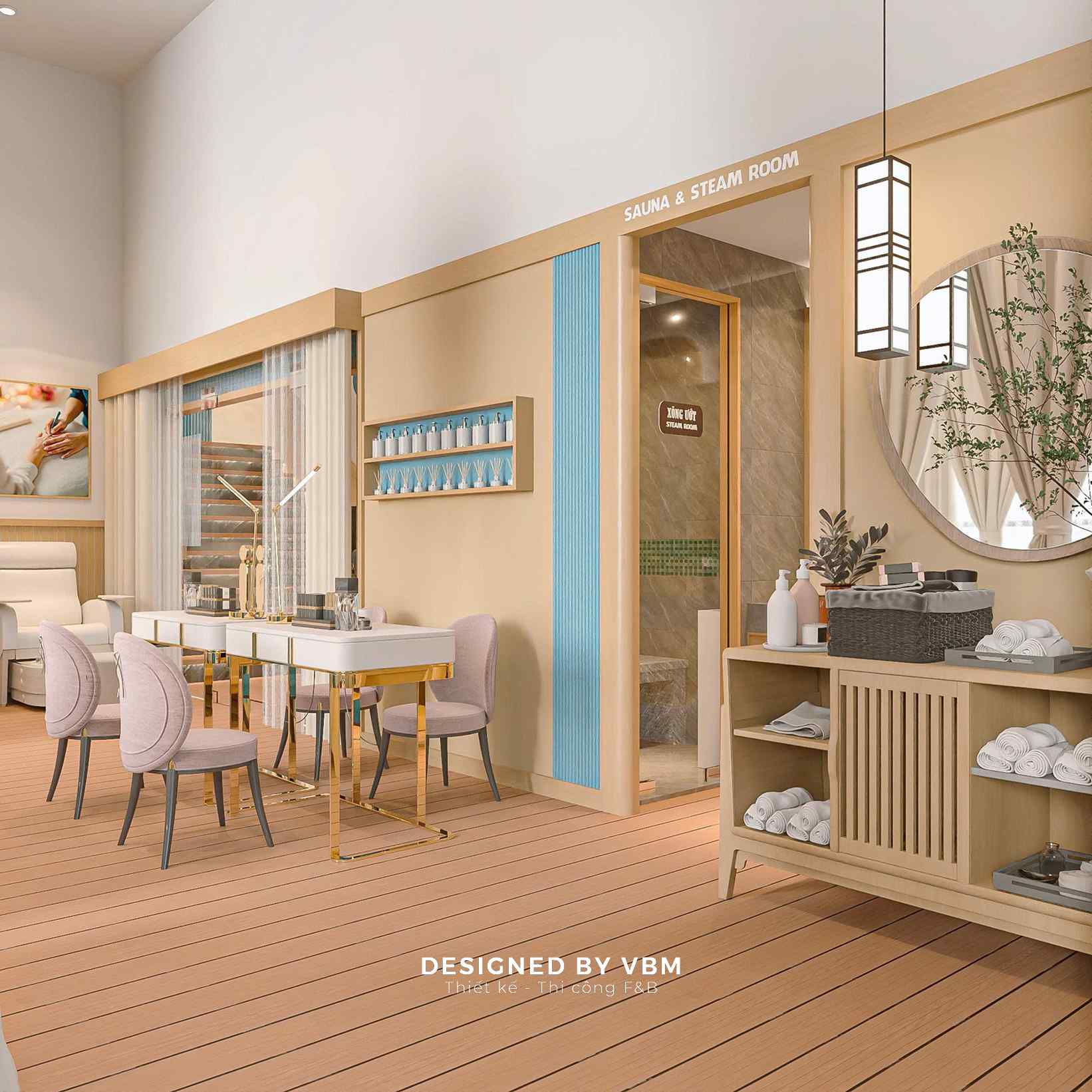 - Không gian chức năng khoa học: Phân chia khu massage, ngâm thảo mộc, và khu nghỉ ngơi rõ ràng nhưng liên kết mềm mại qua rèm và vách ngăn nhẹ.