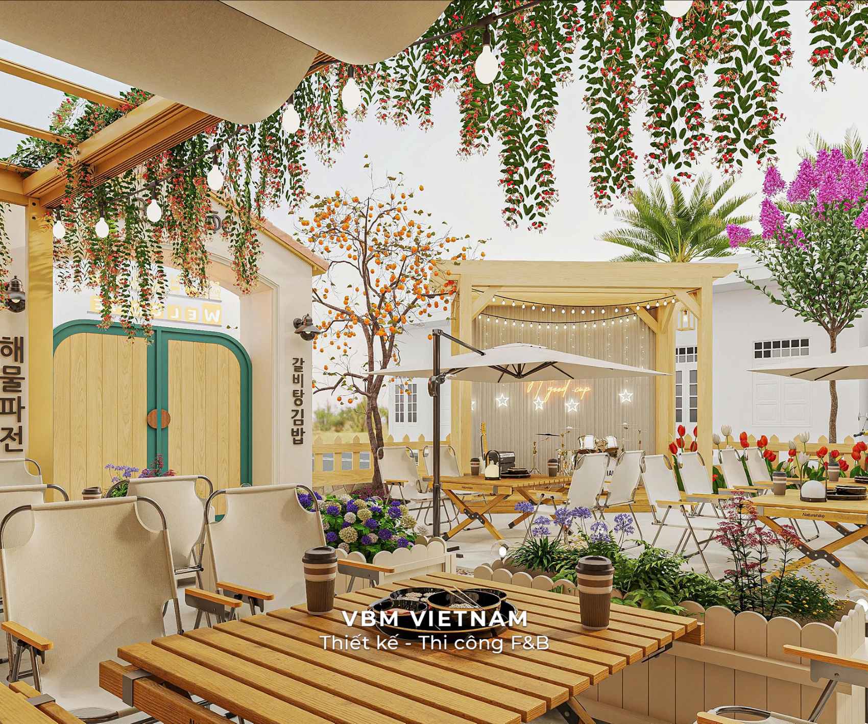 - Khu sân vườn ngoài trời là điểm nhấn nổi bật, với giàn dây leo, bàn gỗ mộc và ánh đèn treo lung linh – tạo nên không gian chill đúng chuẩn “Korean vibe”.