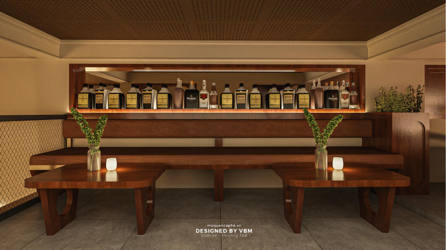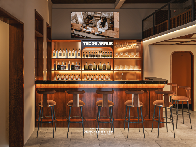 Điểm nhấn chính của The 9H Affair là quầy bar được thiết kế tinh xảo, nổi bật với ánh sáng ấm áp làm tôn lên các loại thức uống cao cấp. Khu vực gác lửng phía trên mang đến không gian riêng tư và thoải mái hơn cho nhóm bạn bè, với ánh sáng nhẹ nhàng và nội thất hiện đại. Tổng thể thiết kế vừa mang hơi thở của cuộc sống đô thị sôi động, vừa tạo nên không gian thư giãn để khách hàng tận hưởng trọn vẹn từng khoảnh khắc.