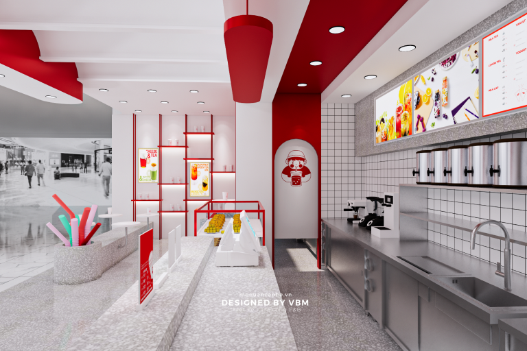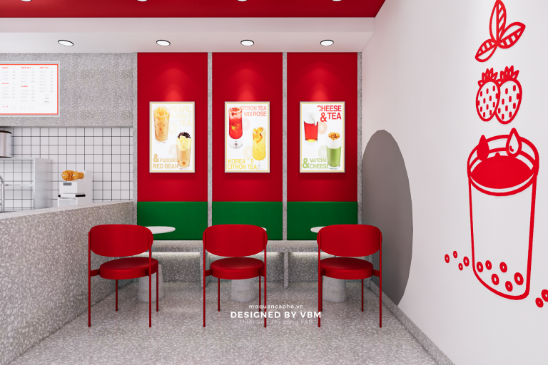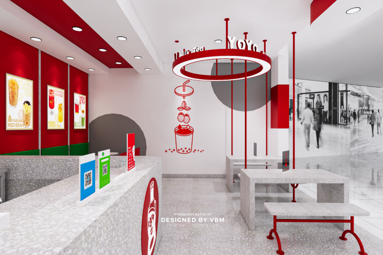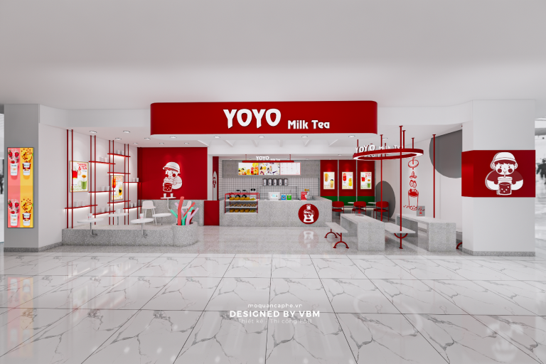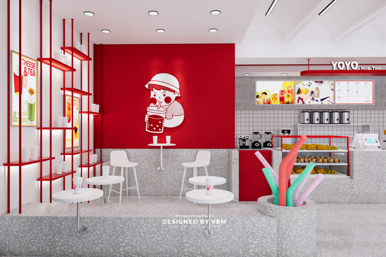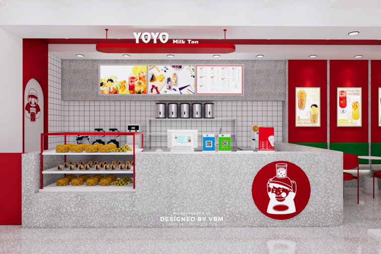 Với tông màu chủ đạo là đỏ và xám, “YOYO Milk Tea” mang đến sự ấm áp và phóng khoáng. Quầy phục vụ nổi bật với logo “YOYO Milk Tea” sẽ khiến bạn cảm thấy như đang đến một thế giới trà sữa đầy màu sắc. Bàn ghế thoải mái và trang trí tinh tế sẽ là nơi bạn có thể thư giãn và thưởng thức những ly trà sữa ngon lành.