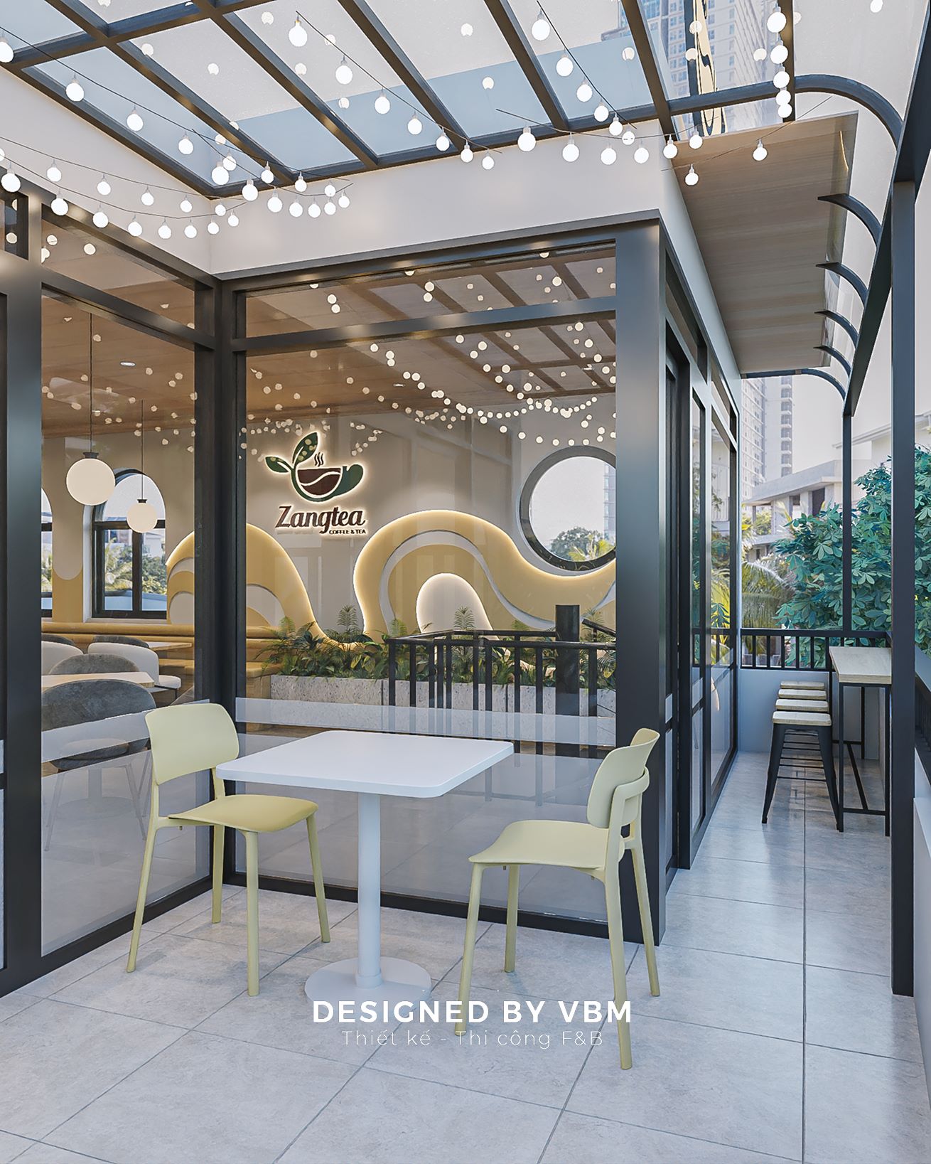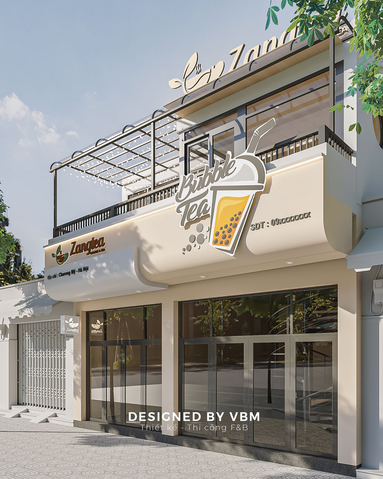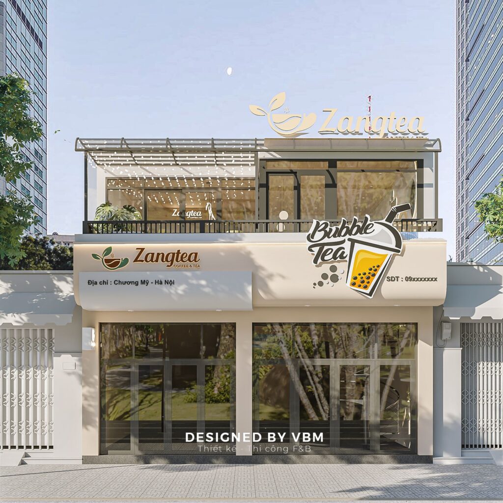 Tọa lạc tại vị trí đắc địa, Zang Tea sở hữu thiết kế mặt tiền ấn tượng với những đường nét kiến trúc mạnh mẽ nhưng vẫn mềm mại nhờ hệ cửa kính lớn và các khung vòm cong tinh tế. Tông màu nâu gỗ kết hợp cùng các mảng xanh tạo nên sự hài hòa, mang đến cảm giác gần gũi, thư giãn cho khách hàng ngay từ cái nhìn đầu tiên.