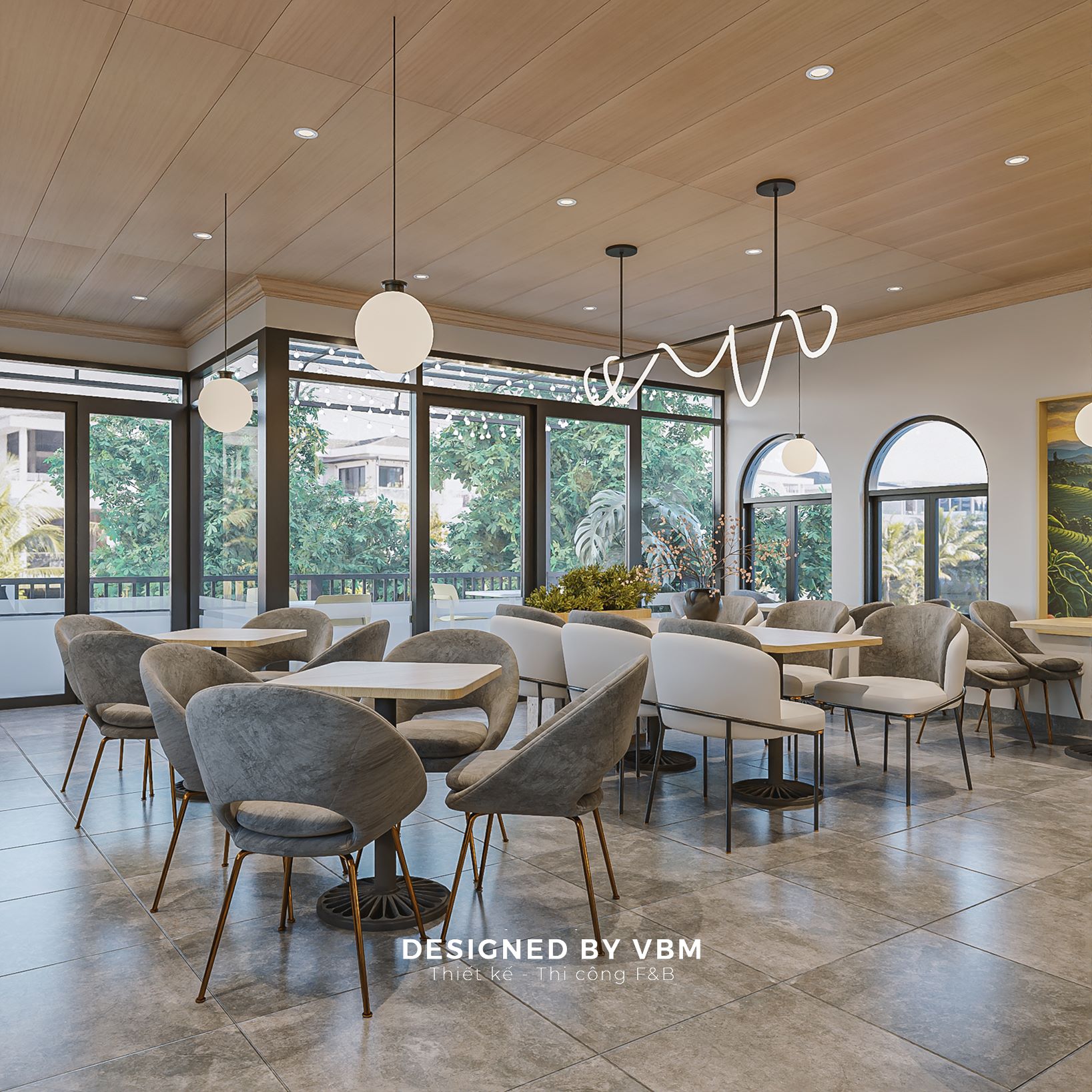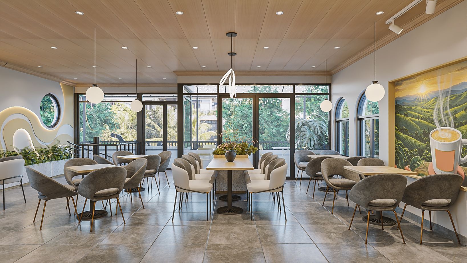 Bước vào bên trong, khách hàng sẽ bị thu hút bởi thiết kế nội thất mở, tận dụng tối đa ánh sáng tự nhiên. Không gian được chia thành nhiều khu vực khác nhau, từ bàn dài cho nhóm đông đến các góc nhỏ riêng tư dành cho những ai muốn tìm kiếm sự yên tĩnh. Các chi tiết nội thất với chất liệu gỗ ấm áp, điểm xuyết sắc xanh từ cây cối, tạo nên tổng thể hài hòa, mang lại cảm giác dễ chịu và đầy cảm hứng.